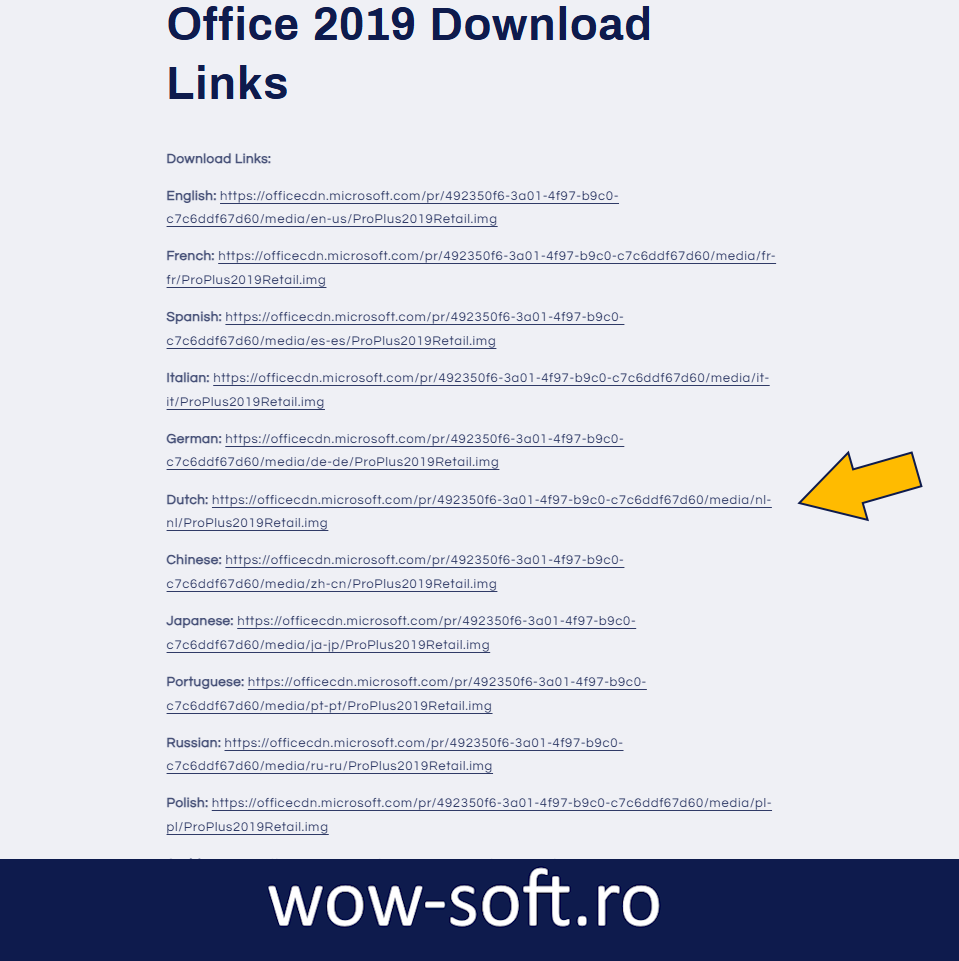 Descărcați fișierul de instalare Office Pro Plus 2019 în limba dvs.: https://www.wow-soft.ro/pages/how-to/how-to-download-office-professional-plus-2019-setup-file